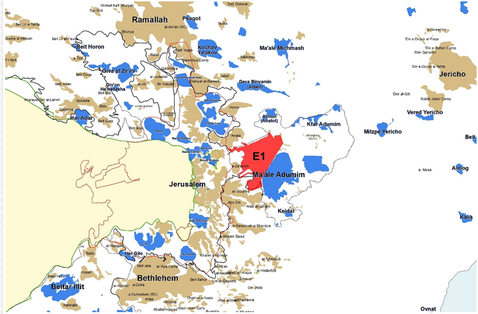 Die israelische Regierung treibt momentan das völkerrechtswidrige Siedlungsprojekt E1 voran. 3.401 Wohneinheiten sollen im strategisch wichtigen Korridor zwischen der völkerrechtswidrigen Siedlung Ma'ale Adumim und Jerusalem gebaut werden. Dadurch zerstört die israelische Regierung einen zusammenhängenden palästinensischen Wirtschaftsraum zwischen Ramallah (Norden), Jerusalem (Zentrum) und Bethlehem (Süden). Das Projekt wird das Westjordanland in zwei Teile teilen und eine geografische Realität zementieren, die mit einer palästinensischen Staatlichkeit unvereinbar ist.